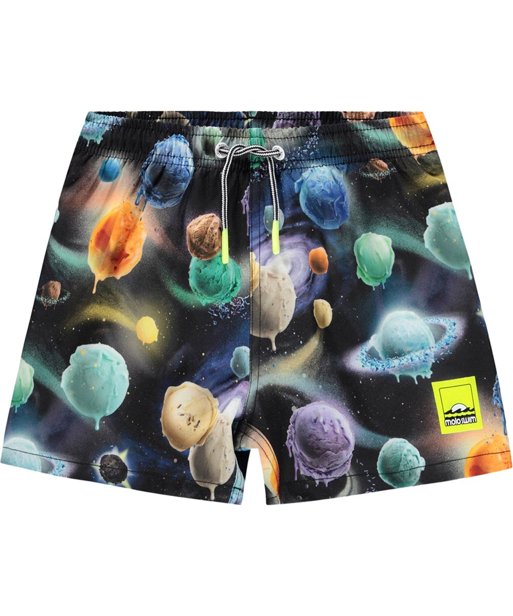 Sporty, multicoloured swim shorts with planet print for active children, made from recycled polyester with UV50+ protection. The shorts have a loose fit, mid-thigh length, elastic and drawstring at the waist, soft inner mesh shorts, and a practical back pocket.This Molo product contains a minimum of 50% GRS-certified polyester recycled
