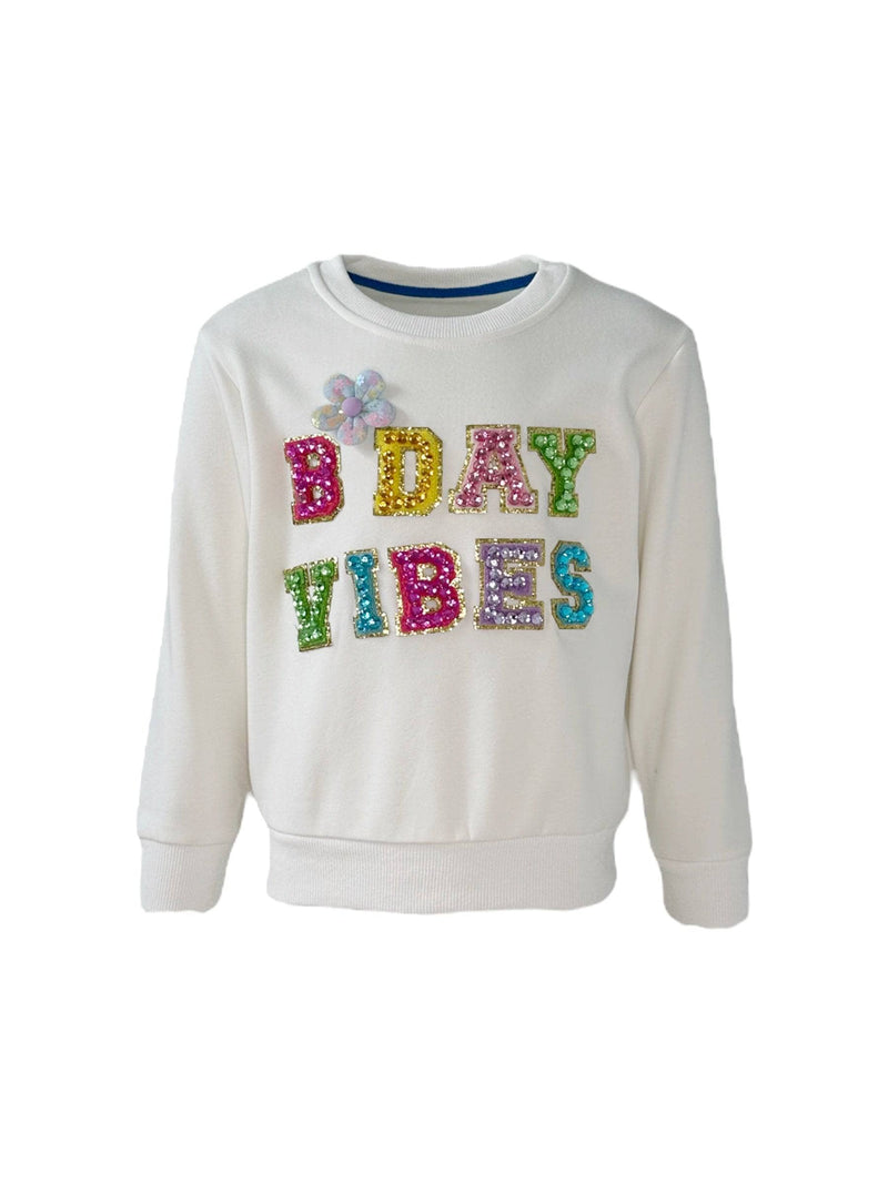 - Celebrate in style with this charming white Birthday Vibes sweatshirt featuring vibrant sequin letters.