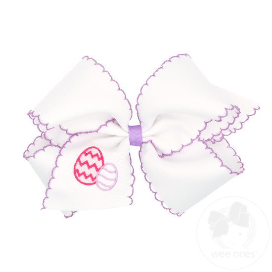 This unique hair bow for girls features Easter-themed embroidery on the tail of a white grosgrain hair bow with contrasting moonstitch edge. This bow is sure to stay in her hair all day with our patented WeeStay™ no-slip hair clip.
