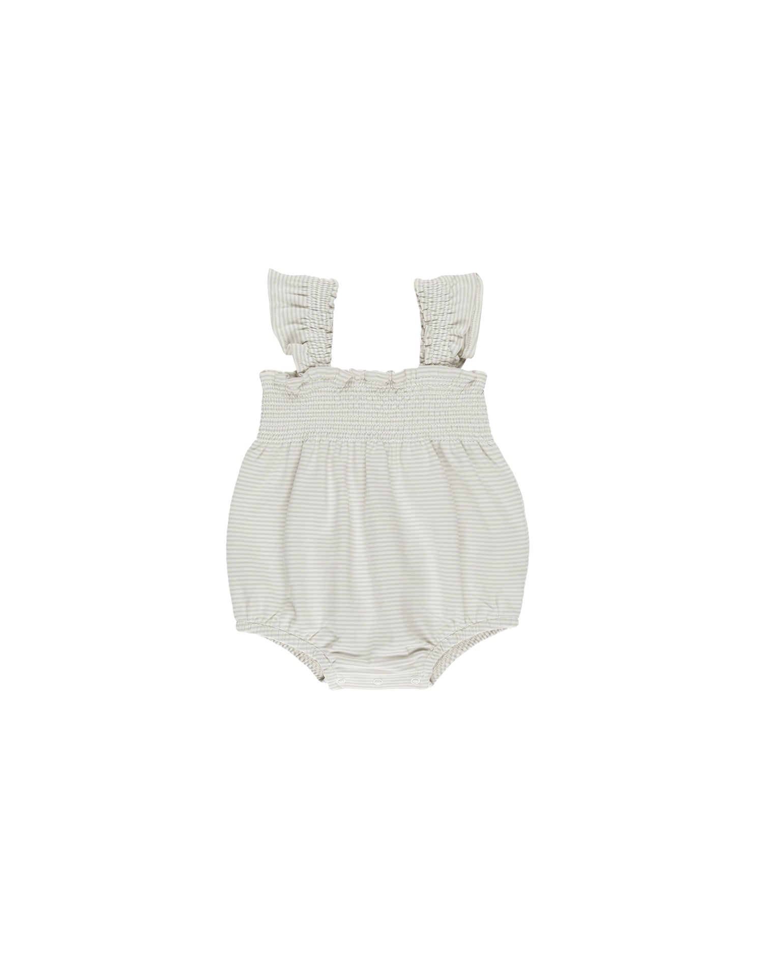 SMOCKED RUFFLE SLEEVE ROMPER || SKY MICRO STRIPE
